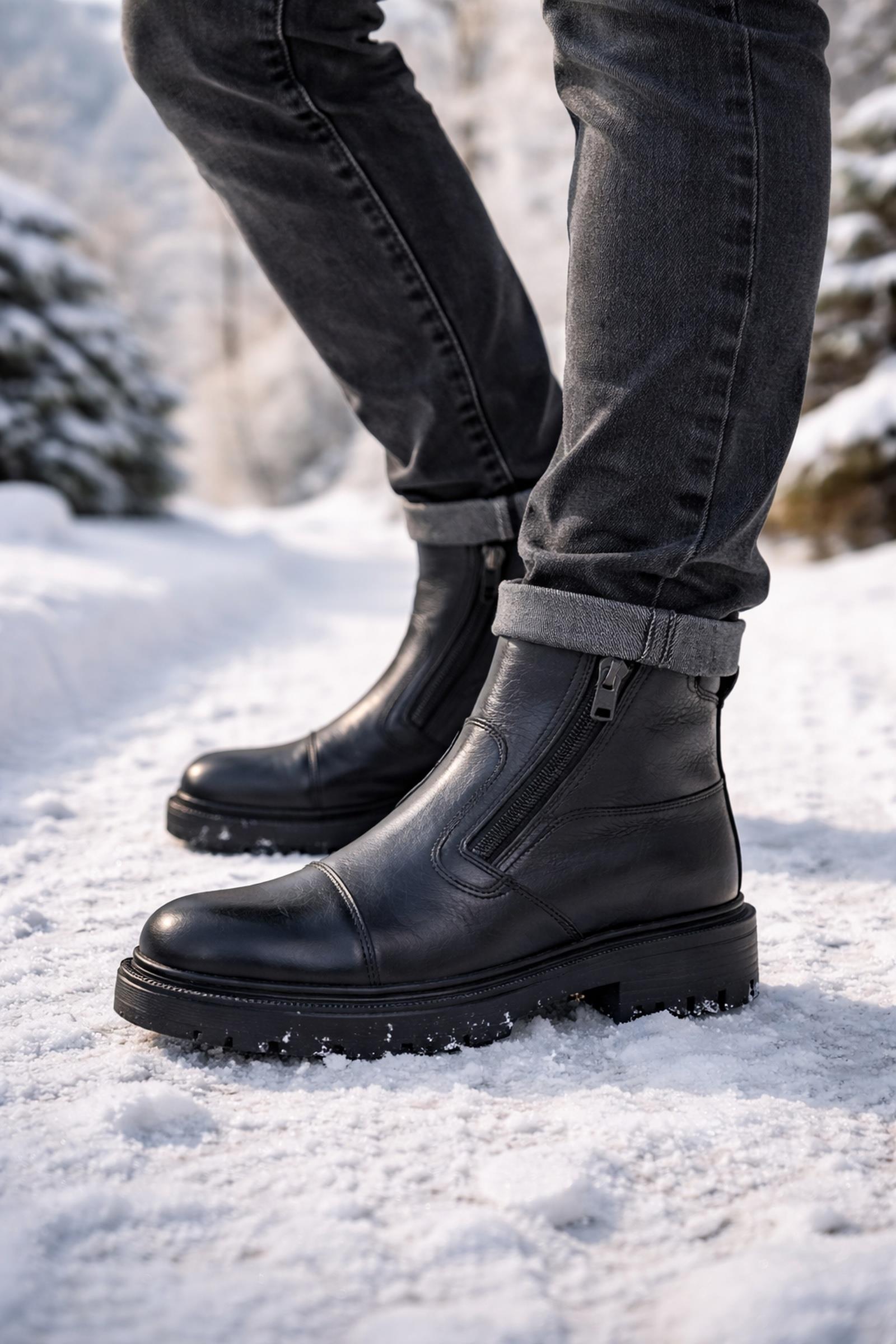 Erkek Siyah Fermuarlı Deri Bot – Kışlık, Şık ve Dayanıklı